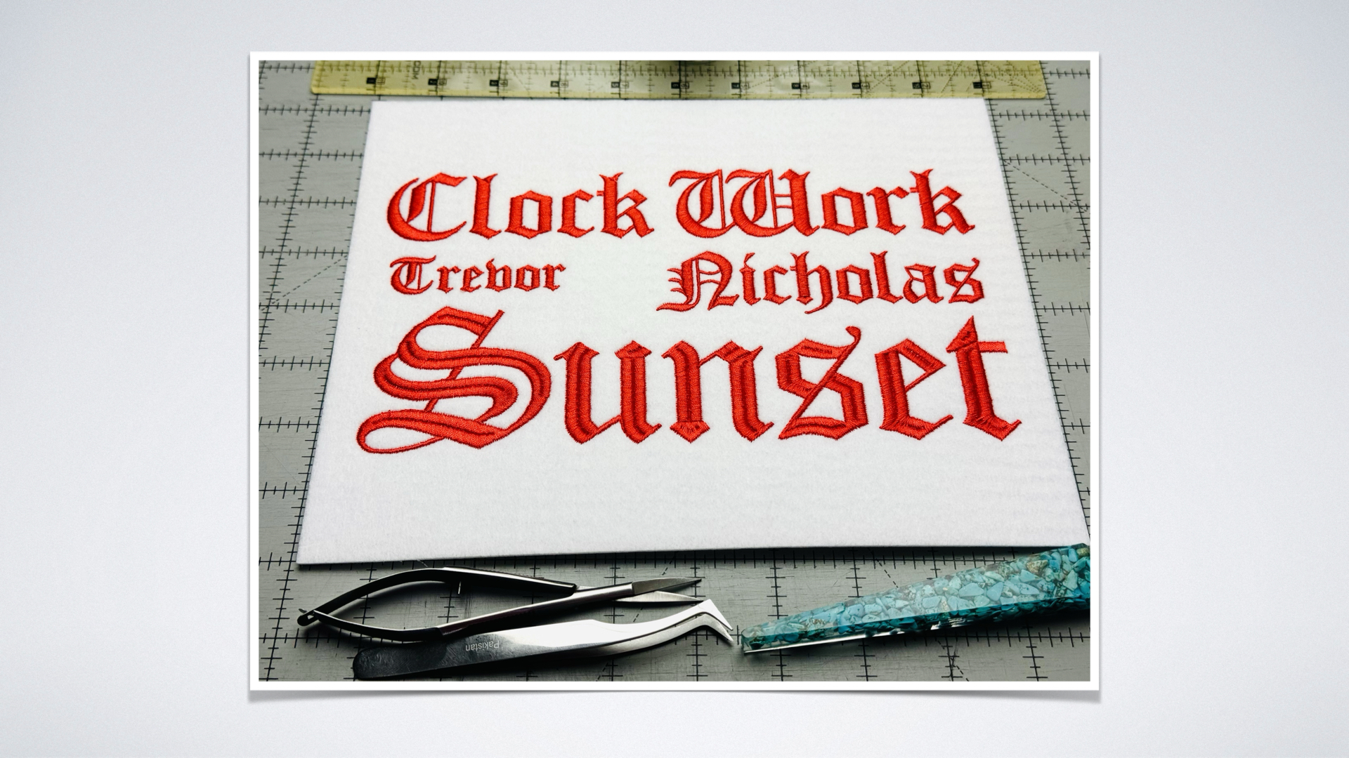 Sunset Embroidery Font 25 is Clock Work. This is a stylized Block font that is ornate and regal. This font is inspired by Old English text. We feel the ideal size is 1.5 inch however it should look good as small as 1 inch and up to 2 inches tall. Larger sizes would be easy to accomplish with minimal editing needed. Try using “middle Split” to create an extra interesting look while still avoid long stitches in the corners at larger sizer.